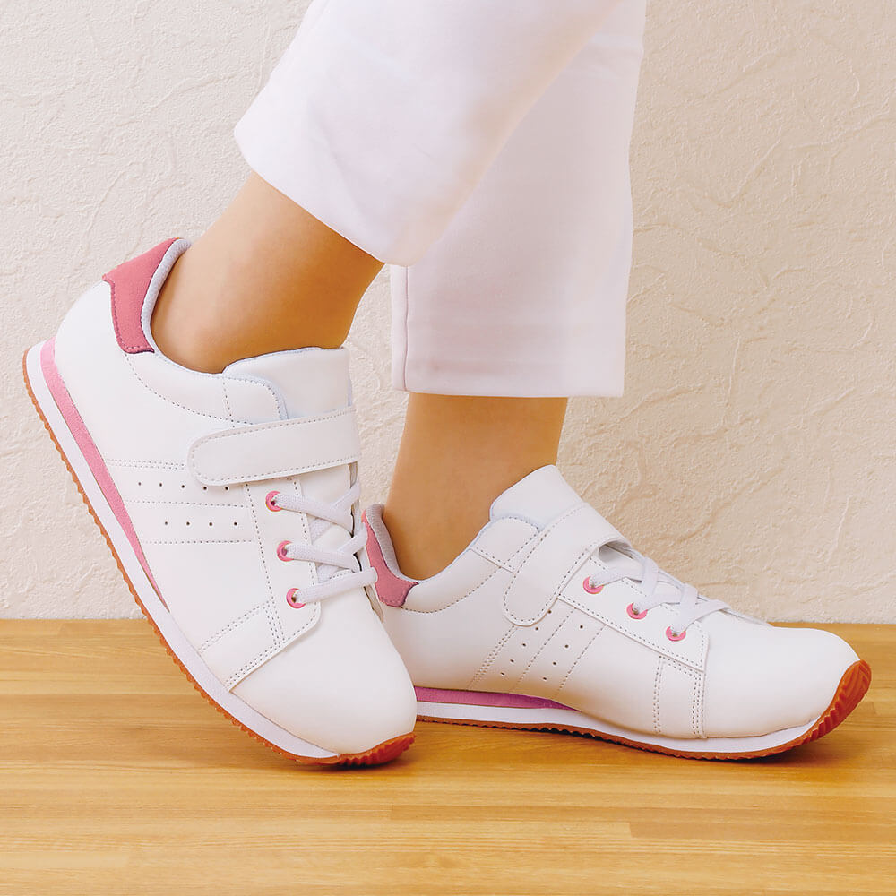 ●素材/アッパー:合成皮革・ナイロンメッシュ、底材:EVA・ラバー●重量/約190g(片足24.5cm)●ヒール高/約2.5cm●タイプ/ 3E●インソール取りはずし/可○軽量【着用イメージ】【ポイント】かかと部分は肌ざわりのいいスエード調だから、やさしい印象に面ファスナーで甲高調整可能平ゴム仕様の靴ひもで、ほどけにくく程よくフィット靴裏(飴色のラバー使用なので滑りにくく、床に色が付きにくい)【カラー】