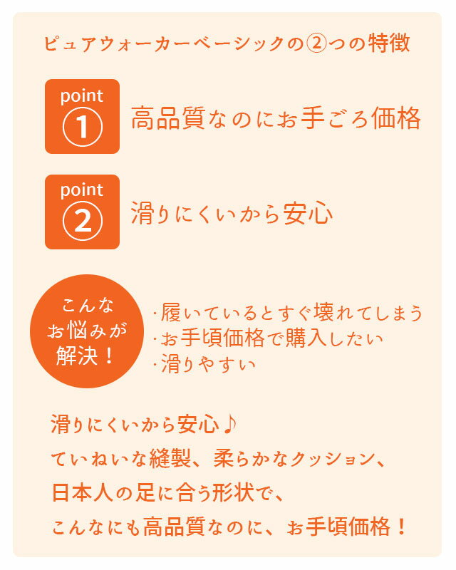 しっかりした縫製と柔らかなクッション性、そしてお手頃価格!それがピュアウォーカーです。