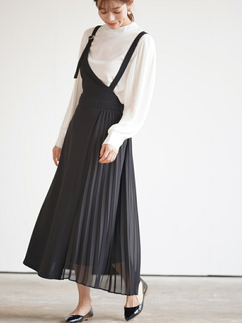 左サイドをシフォンプリーツで切り替えたスカートデザインが華やかな雰囲気を醸し出します。